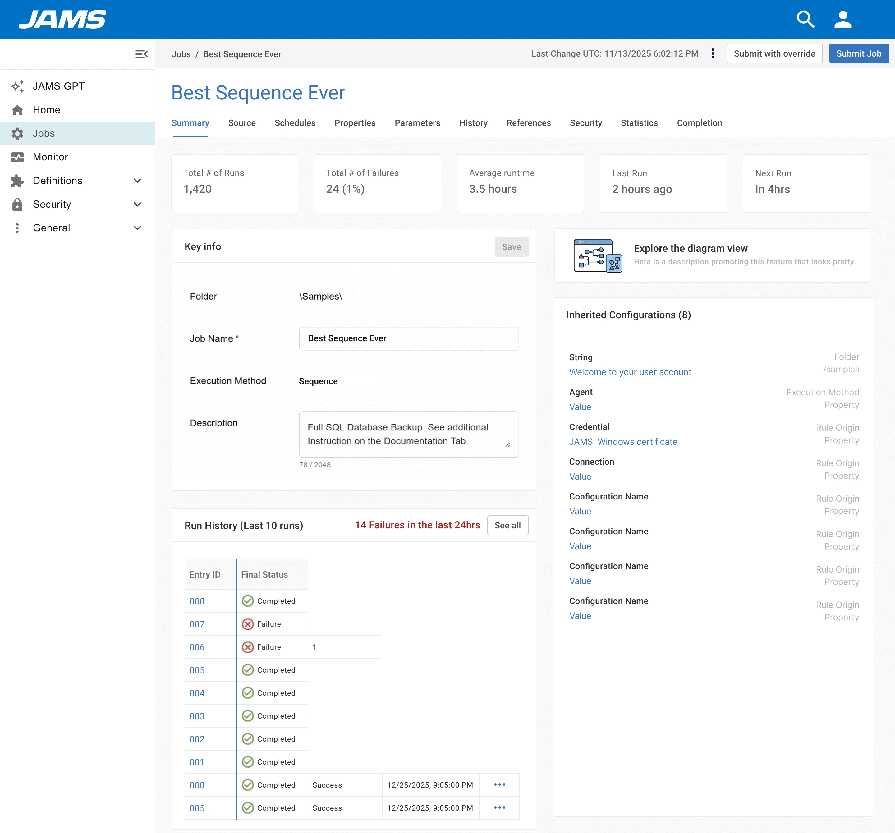 The summary view was redesigned to highlight the information users need most often: job health, recent failures, run history, dependencies, and upcoming executions. By consolidating these signals into a single view, users can quickly assess the state of a job without navigating across multiple tabs.