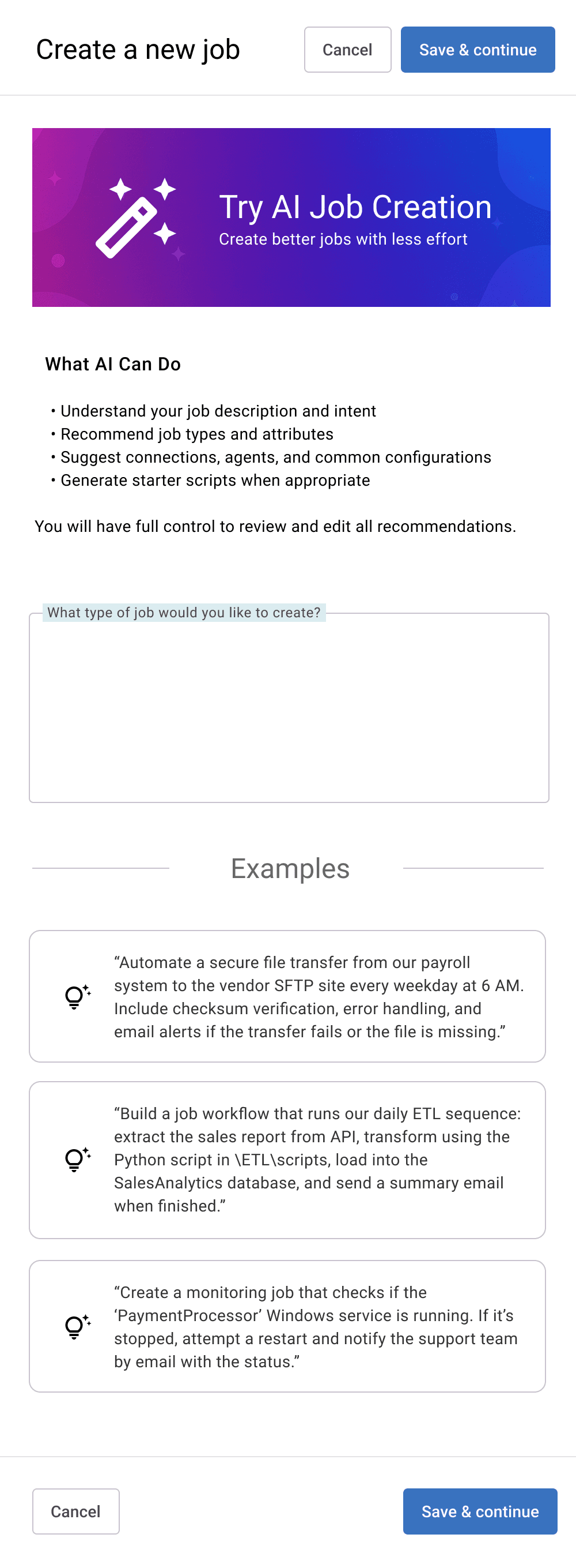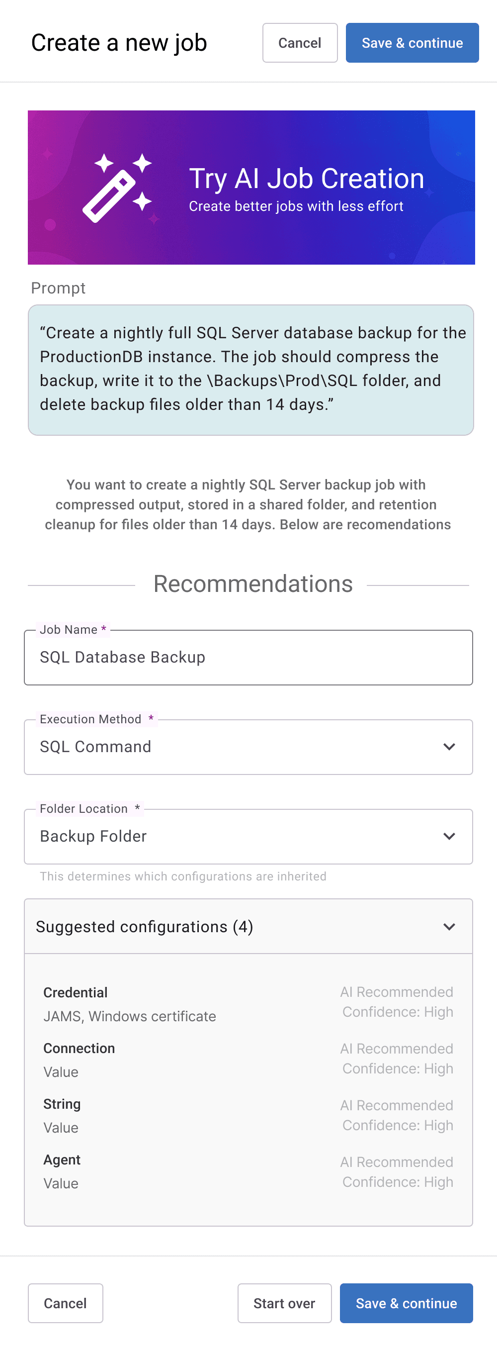 We introduced AI into job creation to reduce setup friction at the earliest and most error-prone stage of the workflow. Instead of asking users to start from a blank configuration, AI helps translate intent into a strong initial setup by recommending execution methods, common configurations, and sensible defaults.