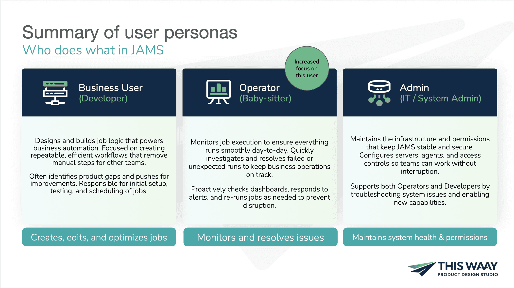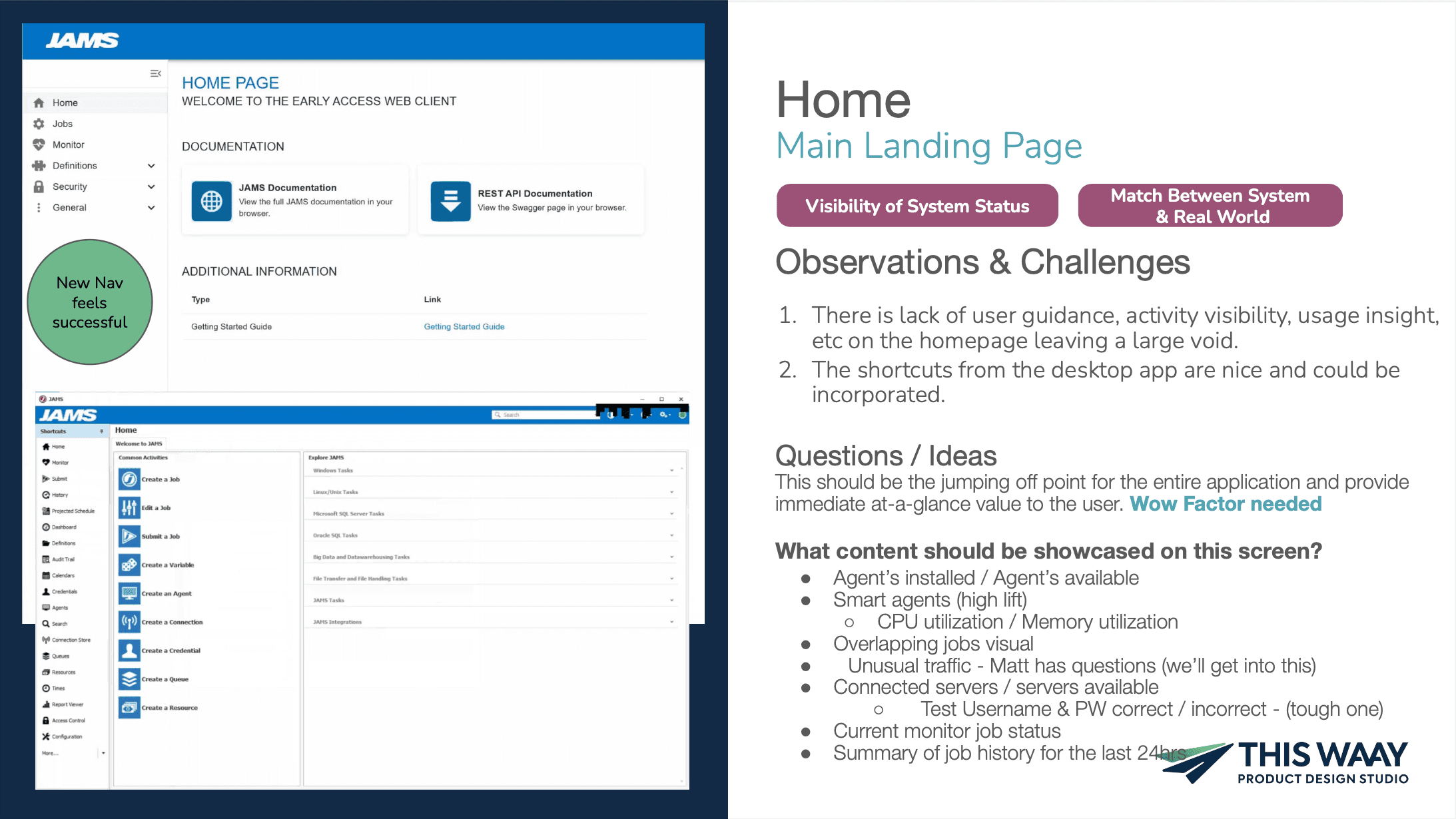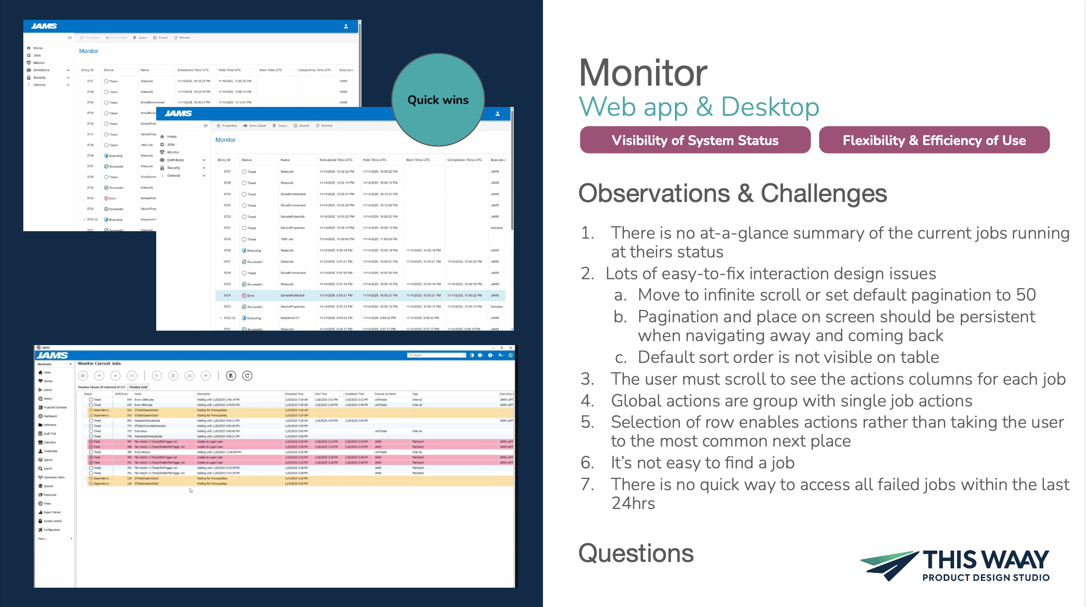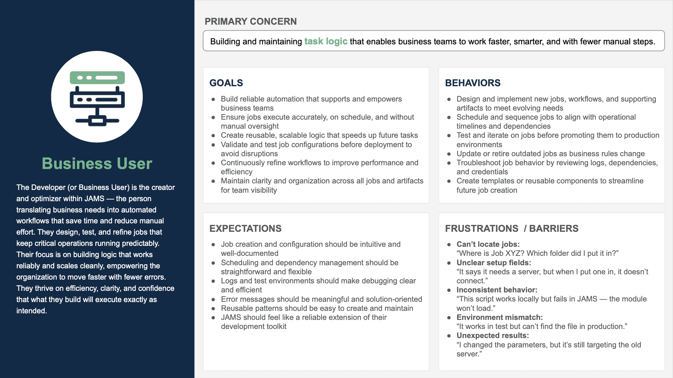 We conducted heuristic evaluations and usability reviews across core JAMS workflows, including monitoring, job creation, configuration, and troubleshooting.