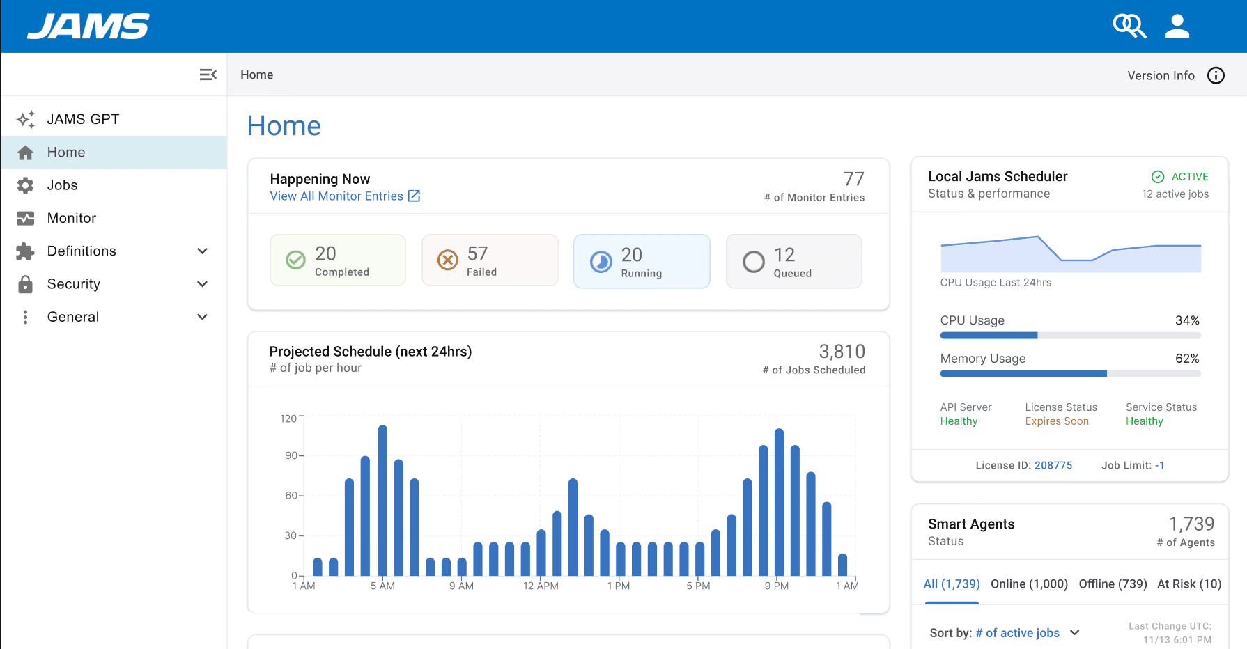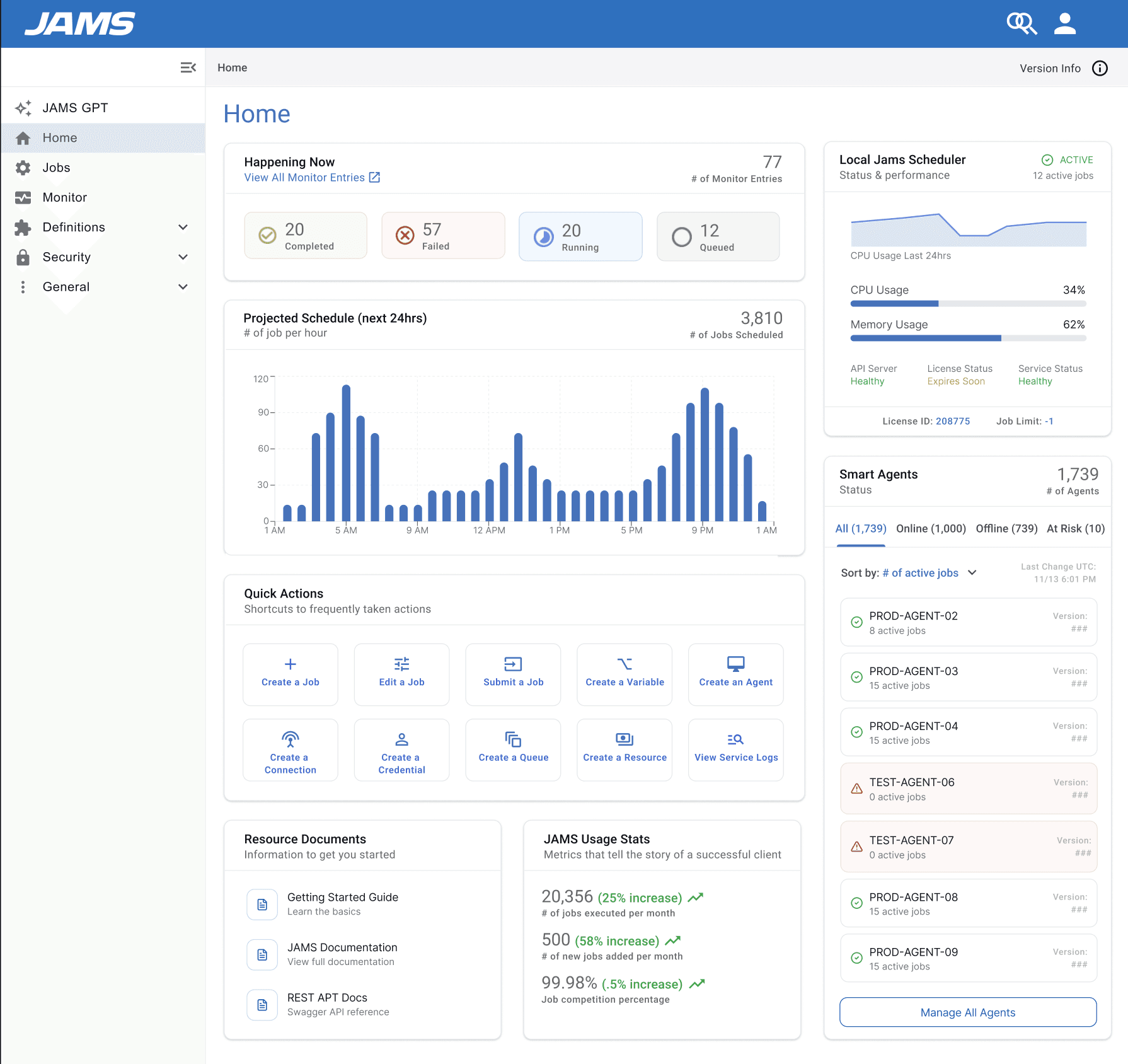 The Home experience acts as a centralized operational overview, bringing together system health, job activity, and frequently used actions in one place. Instead of forcing users to navigate multiple sections to orient themselves, Home provides a clear starting point that supports both quick checks and deeper investigation.