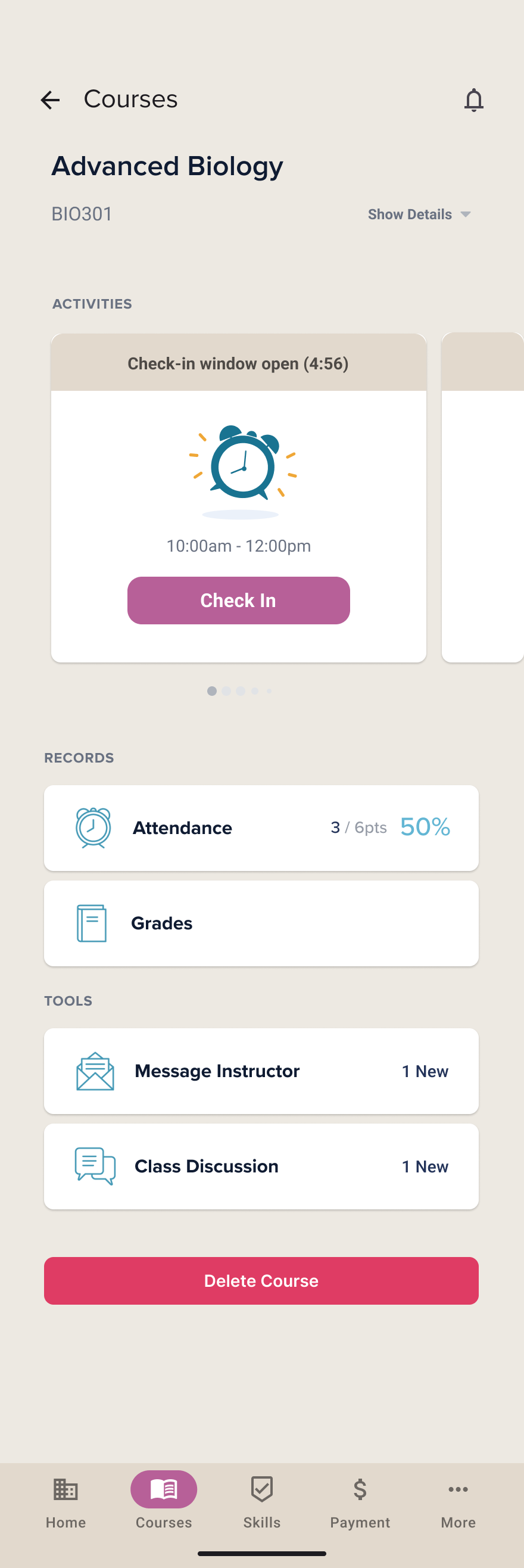 Course detail with records and tools