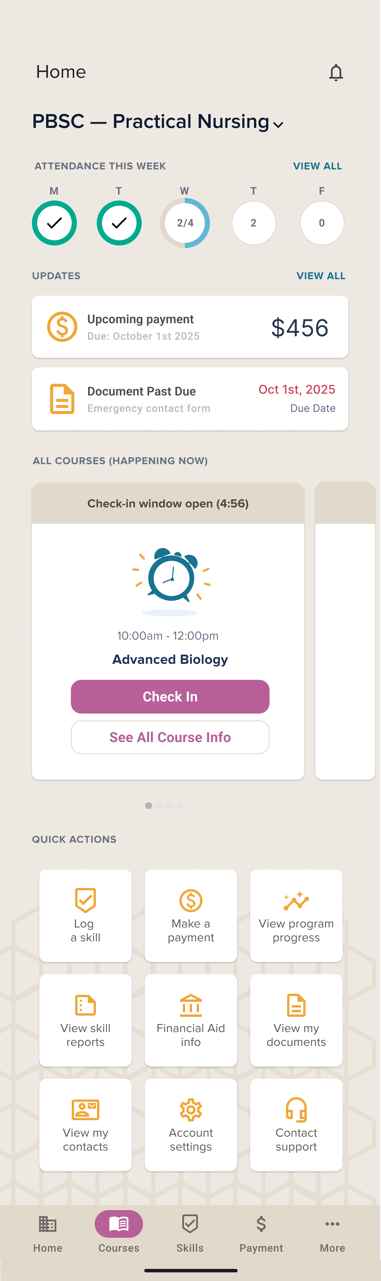 Attendance, updates, payments, and quick actions consolidated into a single home screen — replacing the need to switch between 4 portals. Progress is visible at a glance from day one.